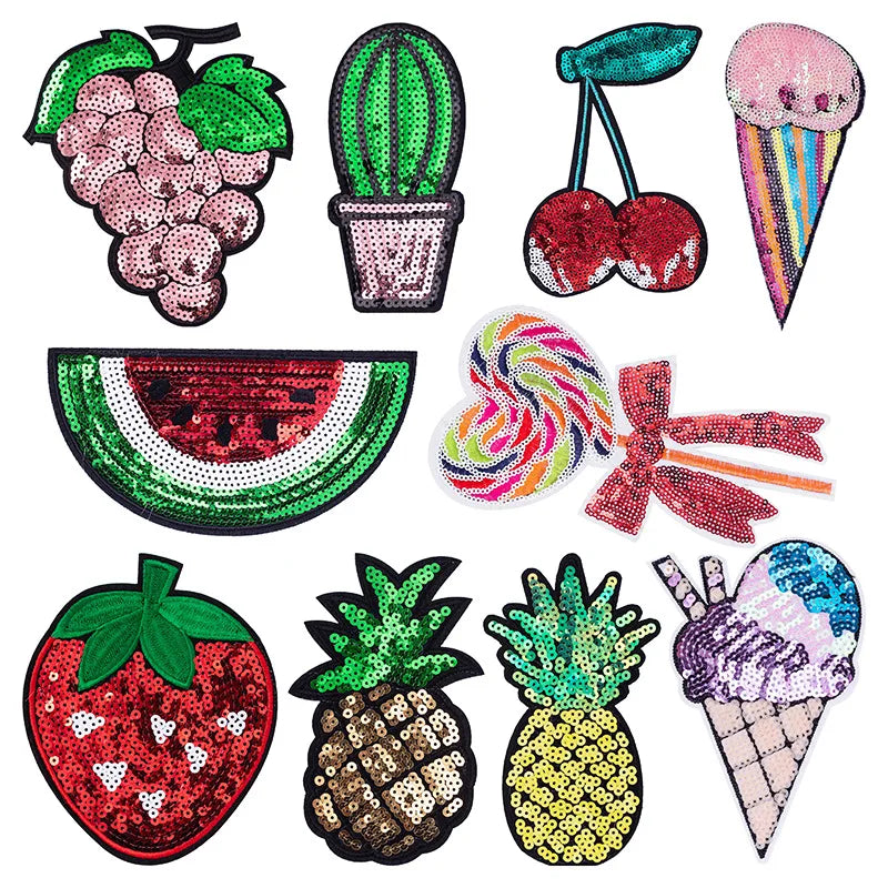 Trendy Sparkling Sequin Patches Iron on Cherry Watermelon Grape Shiny Fruit Sequin Patch for Girl Bag Pants Clothing Patches
