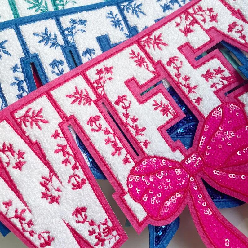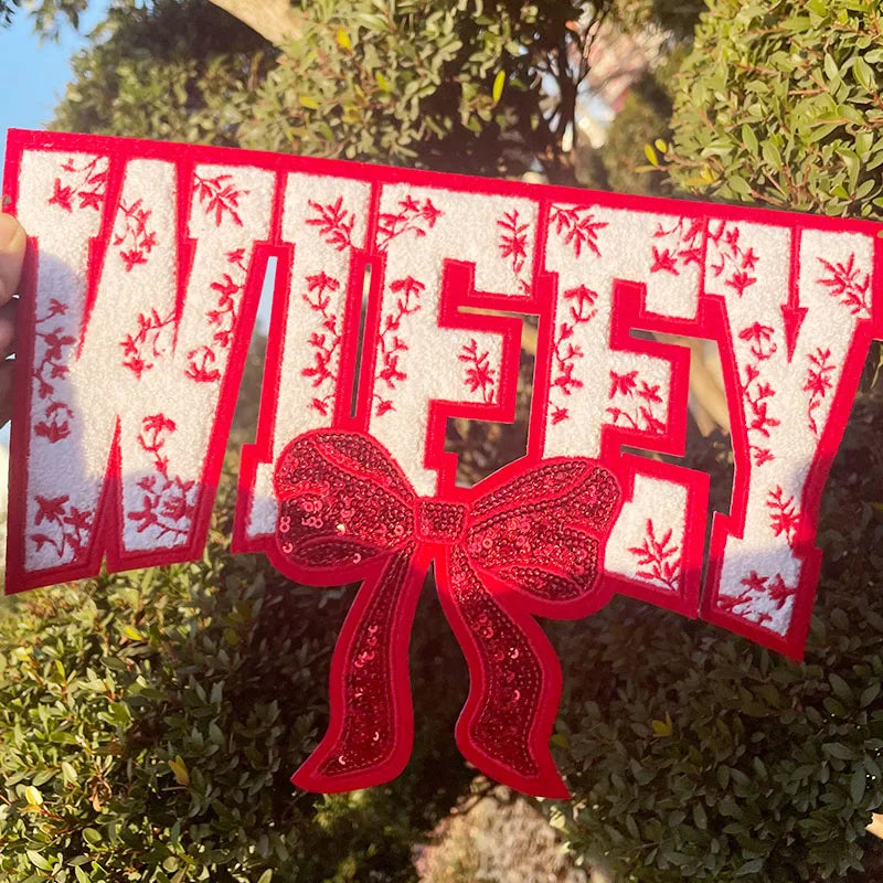 Wholesale Big Mama Patch Clothing Decoration Iron on Embroidered WIFEY Chenille Patches With Sequin Bow for Women Wife Gift