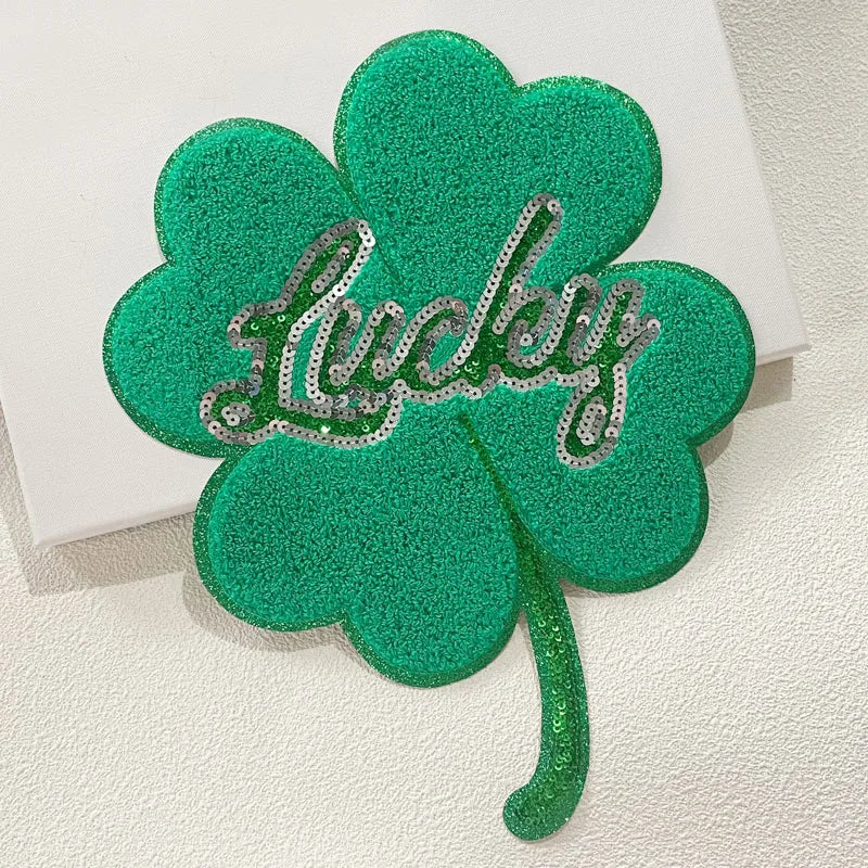 Wholesale Large Chenille Patches Sweatshirt Sequin Green Leaf Clover Iron on Letter Lucky Chenille Patch for Women Man Clothing